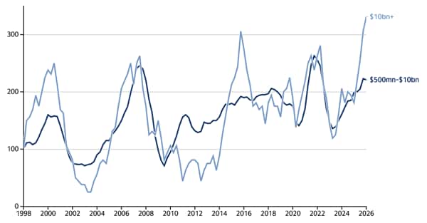 In 2025, deals larger than $10 billion increased 24% from the previous high in 2021, according to Dealogic data. A trend that historically anticipates a broader expansion of the market, thanks to the ability of large players to move more quickly and generate knock-on effects on overall activity.