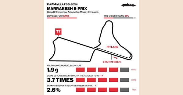 Frenare a Marrakesh può essere estremamente complicato. Infatti, il tracciato è tra i più lunghi della stagione, con i suoi quasi 3 km, ha rettilinei estesi e curve strette dove i freni sono sottoposti a forti sollecitazioni. In un giro al circuito di Moulay El Hassan, circa il 27% del tempo viene impiegato frenando. Il punto più critico è stato individuato all'ingresso in curva 7, una sezione che richiede una staccata violenta e impegnativa da gestire. Per rallentare le monoposto elettriche, i freni Brembo devono generare una potenza quasi 4 volte quella erogata dal motore elettrico. Il contachilometri deve scendere di oltre 100 km/h in circa 100 metri e in meno di 3 secondi prima di entrare nella curva a sinistra successiva.