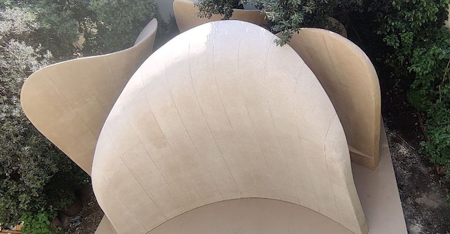 The project develops through four monumental elements, distinct in form and colour, which are arranged like a contemporary cromlech, evoking the concept of temenos, the sacred space of Greek tradition. This configuration does not define a full centre, but on the contrary constructs an absence: an emptiness charged with meaning that becomes the true focus of the work. The title itself, Kenosis, refers to the concept of emptying, understood as a conscious subtraction capable of revealing the essence of space and redefining the relationship between architecture, body and landscape.