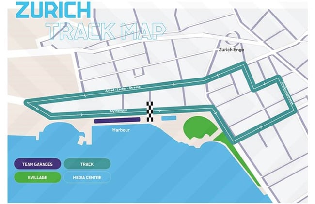 La linea di partenza e la pitlane sono sistemate lungo la zona del porto di Enge, sulla sponda del lago, dove troviamo anche l'E-Village, nella zona verde di Park Arboretum. Il rettilineo principale, invece, attraversa il lungo viale alberato e porta a una veloce curva a destra che punta dritta verso il centro della città.
