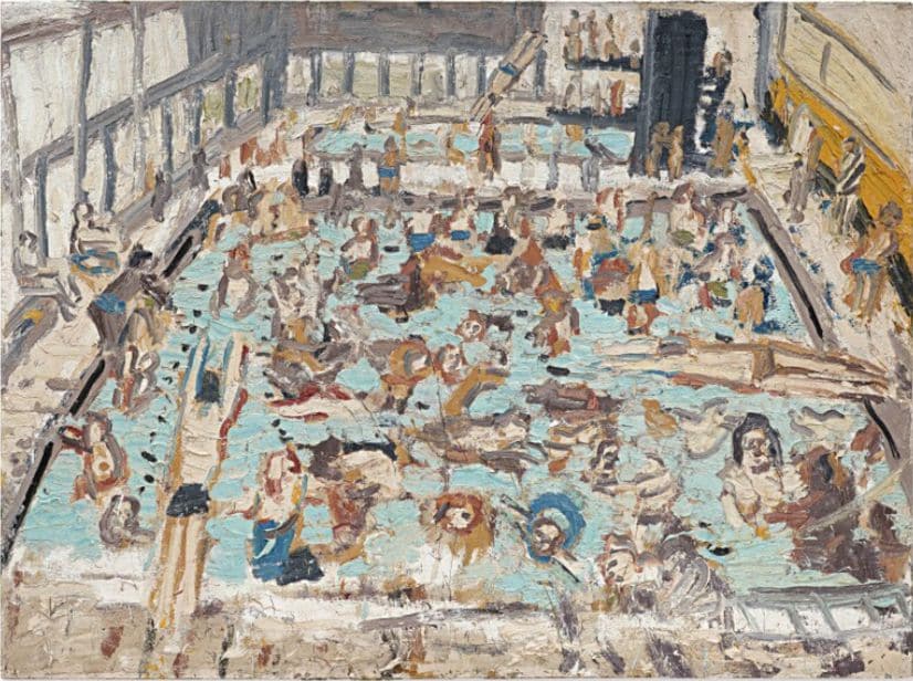Almost £36 million is owed for four paintings from the Lewis Collection of post-war British art. The main surprise was the result for a large, unusually sunny composition by Leon Kossoff from 1969, depicting a public swimming pool with typical Brutalist architecture, crowded with children on an August morning, which was long fought over by a dozen suitors to a record price of £5.2 million, a multiple of the estimate of £600-800,000.