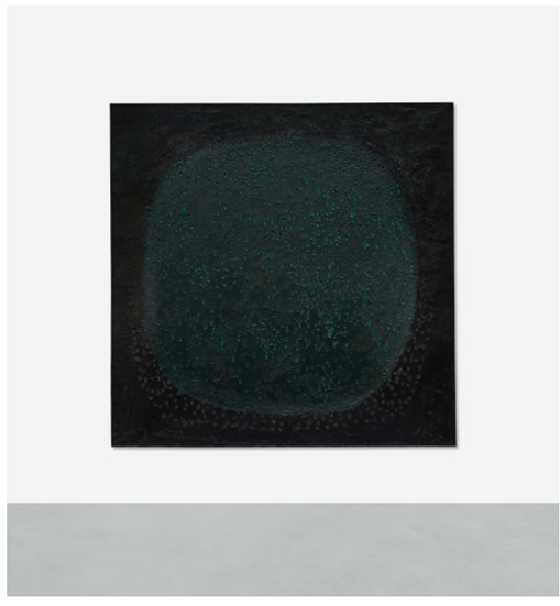 A German collection of seven works from the 1950s-60s guaranteed by the auction house offered as many as five works by Fontana, led by a 2 metre 'Spatial Concept' from 1960 with holes and cuts on a black and green background, also guaranteed by third parties at an estimate of 8.5-12 million, which after a couple of bids online and in the auction room ended up at 8.1 million, rising to 9.8 million with commissions, an important price for a work that is not easy. Even a perfect 'Waiting' with a single cut on unfinished canvas from 1960, an early and experimental period in the conception of 'cuts', stopped at 1.4 million, below the estimate of 1.5-2 million, after a single raise to 1.8 million with commissions, narrowly surpassed by a bronze 'Nature' (posthumous) which fetched 1.9 million, from an estimate of £1.2-1.8 million. An unusually shaped hexagonal Theatre, initially unsold from an estimate of £350-450k, was offered again at the end of the auction and sold with a single bid to £260k, while a rather sombre 'Spatial Concept' from 1955 found a single buyer at £650k, below the estimate before commissions were added. Also part of the German collection, a medium sized bronze of Alberto Giacometti 'Femme Debout' surpassed its estimate, also contested in the room to £5.1m.