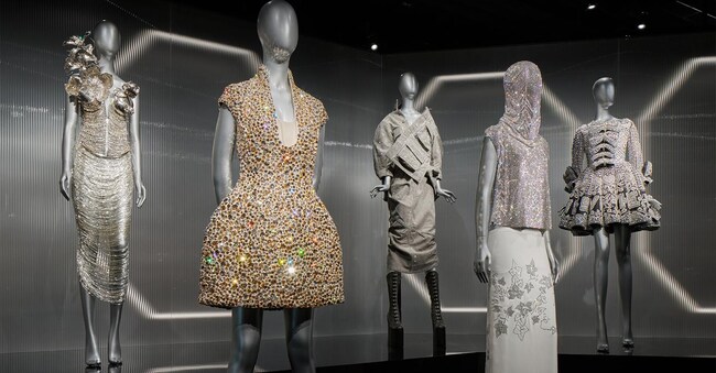 The route follows seven key themes, Time Chamber, Masters of Light, Future History, Jewelry Box, Pop Icons, Mathemagical and Diamonds of the Future, the latter dedicated to the launch of the Galaxy collection, Swarovski's first made with laboratory diamonds. On display are some 60 creations showcasing Swarovski crystals, signed by Prada, Atelier Versace, Gucci, Louis Vuitton, Alexander McQueen and Armani Privé, among others, along with outfits worn on special occasions such as the Met Gala and the Grammy Awards (Harry Styles' harlequin jumpsuit signed Egonlab x Swarovski), as well as hundreds of jewellery creations and the largest crystal chaton ever made.