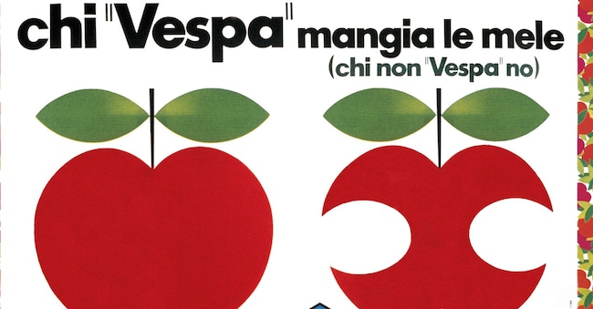 Piaggio's famous 1969-1970 advertising campaign, designed by Gilberto Filippetti of the Leader agency, associated the Vespa with a young, free and transgressive lifestyle. The apple symbolised, in fact, the 'fruit of sin', suggesting that those riding the Vespa were modern and attractive. "Vespare" was synonymous with freedom: the combination with the apple (sin/transgression) was intended to make the Vespa an icon not only of transport, but of identity and youthful rebellion. The campaign was so successful that in 1971 it evolved into the catchphrase 'Melacompro' and, in 1983, Vasco Rossi quoted the motto in his song 'Bollicine' (1983) with the variant 'chi non vespa più e mangia le pere' (who doesn't vespa anymore and eats pears).