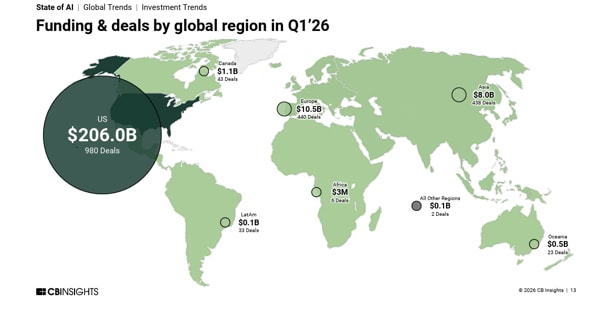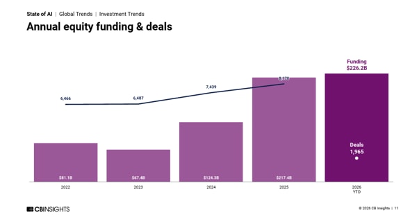 In the first quarter of 2026, the global artificial intelligence market for private (unlisted) companies experienced unprecedented growth, with the total amount raised amounting to $226 billion in 1,965 deals globally. A level that, in just three months, surpasses the entire amount raised during 2025 of $217 billion in 8,170 deals, marking a significant acceleration in capital flows to the sector.