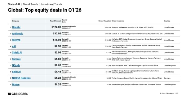 On the sector front, the dominance of large language models (LLM) persists. In addition to OpenAI, Anthropic (USD 30 billion in a Series G round in February for a total valuation of USD 380 billion) and xAI (closed a USD 20 billion round in January, bringing the valuation to USD 200 billion) also completed multibillion-dollar deals, confirming the centrality of model developers in catalysing investments.
