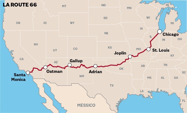 Route 66 is a historic US highway that connects Chicago, Illinois, to Santa Monica, California, passing through eight states: Illinois, Missouri, Kansas, Oklahoma, Texas, New Mexico, Arizona and California. Also known as 'The Mother Road' or 'The Main Street of America', it is famous for its role in the imagery of the American 'road trip' and stories of migration and opportunity during the Great Depression. Although no longer part of the federal highway system, today it is renamed 'Historic Route 66' and remains a popular tourist destination for its nostalgic atmosphere and vintage attractions.